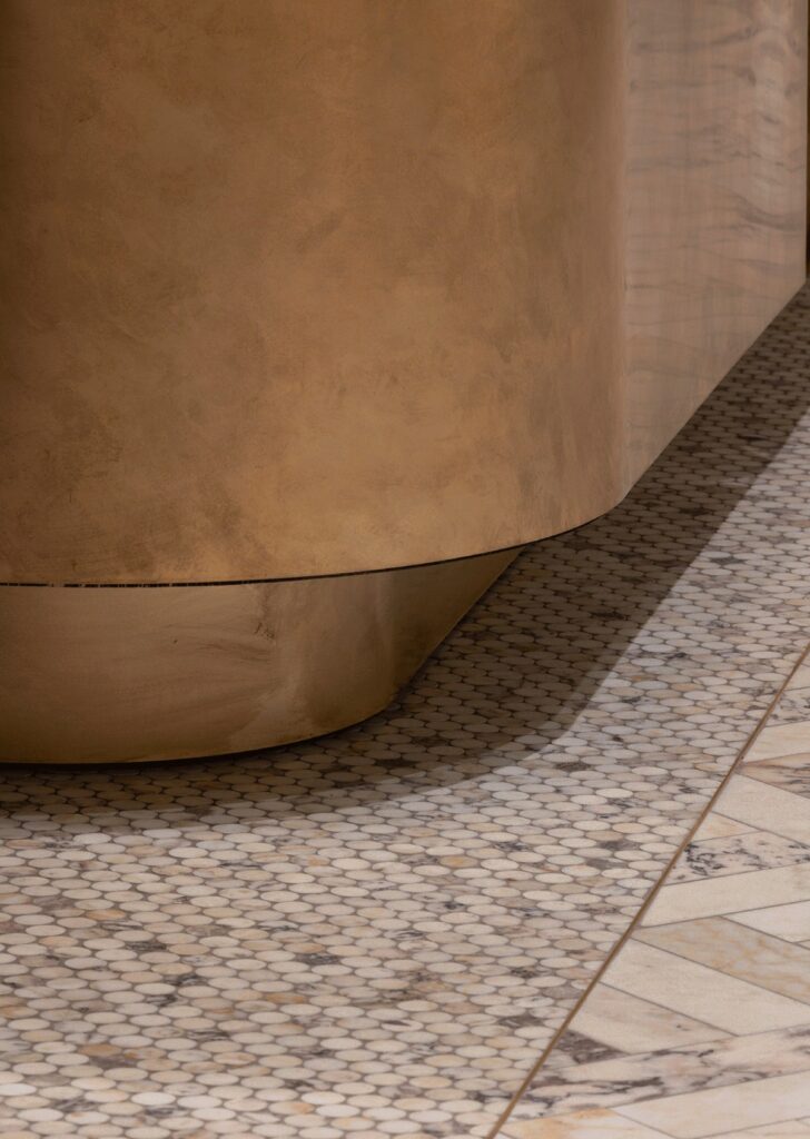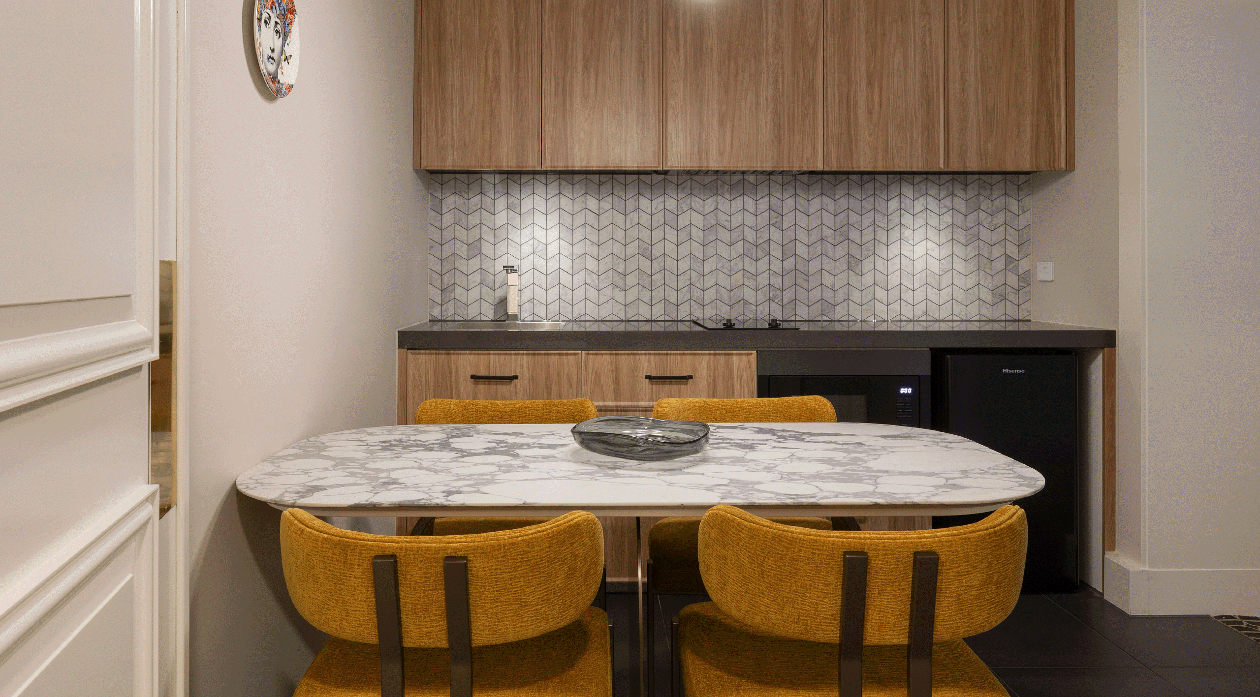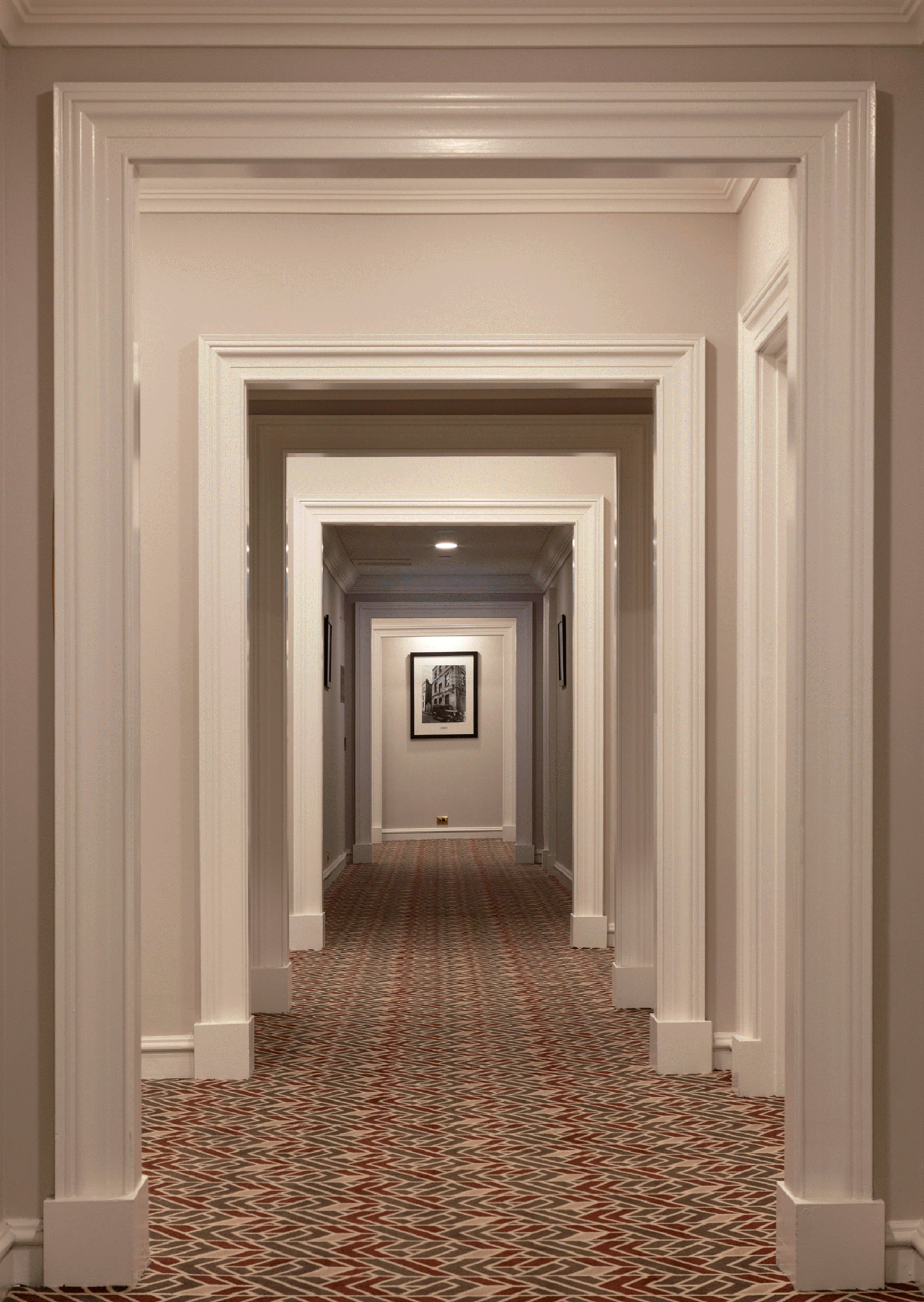On the ground floor, Dezign replanned the reception and guest lounge to create a more generous and welcoming arrival. Marble flooring, venetian plaster, pressed metal ceilings, new artwork and soft furnishings were introduced, with an electric fireplace anchoring the lounge and enhancing the sense of warmth and character.